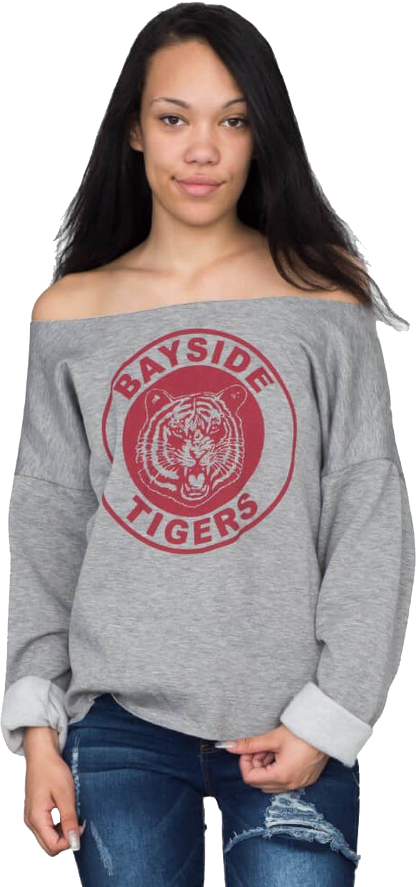 Great off-the-shoulder Kelly Kapowski sweatshirt!