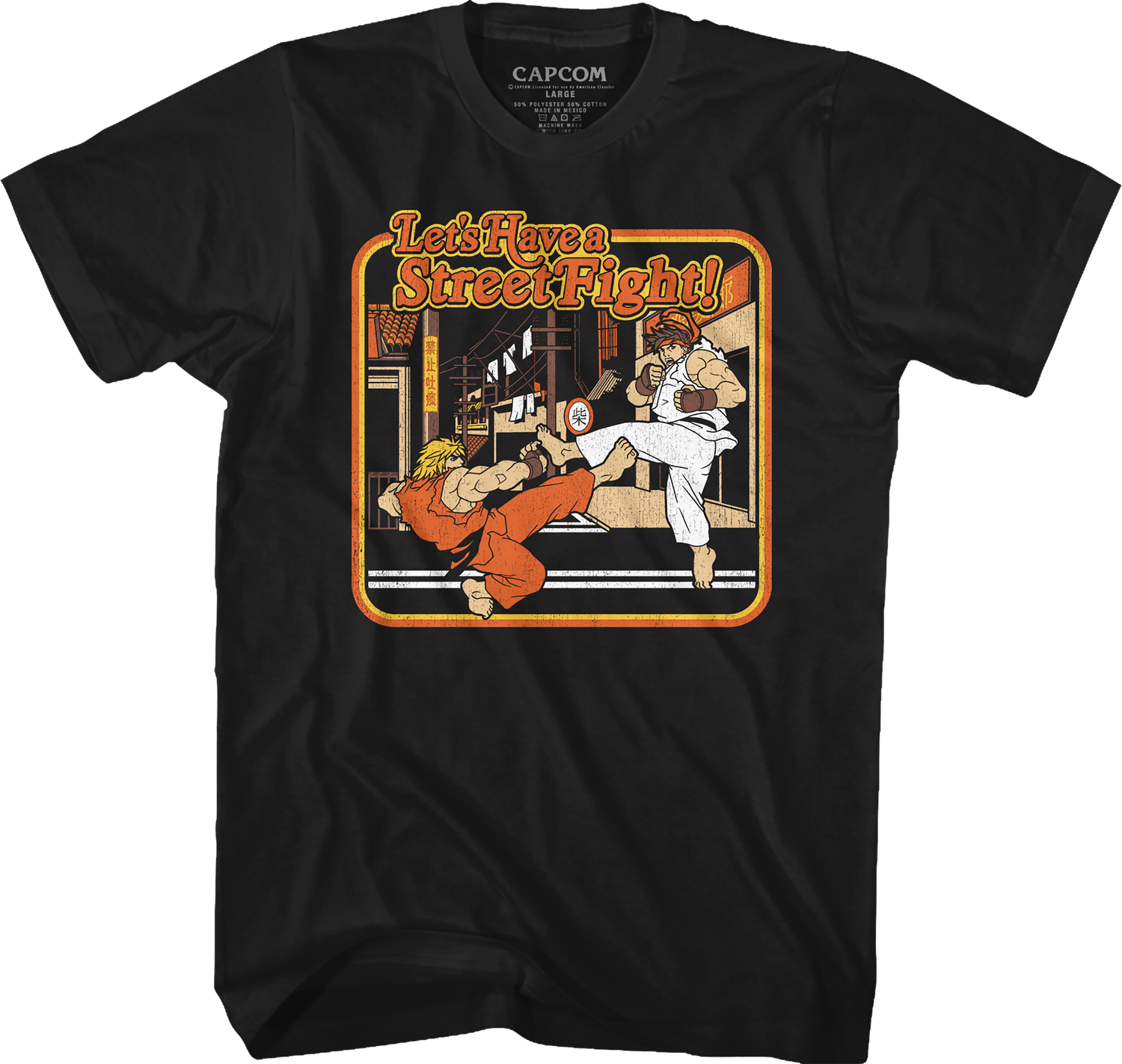 This Street Fighter t-shirt is designed to look like the cover artwork for a children's book titled Let's Have a Street Fight! The artwork shows Ken Masters and Ryu fighting to earn the title of Grand Master.