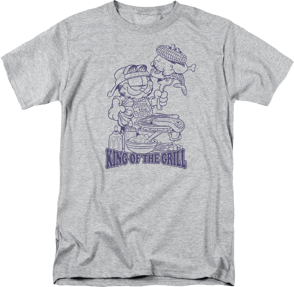 This Garfield t-shirt shows the popular tabby cat cooking a smorgasbord of food on the grill. The shirt reads King Of The Grill.