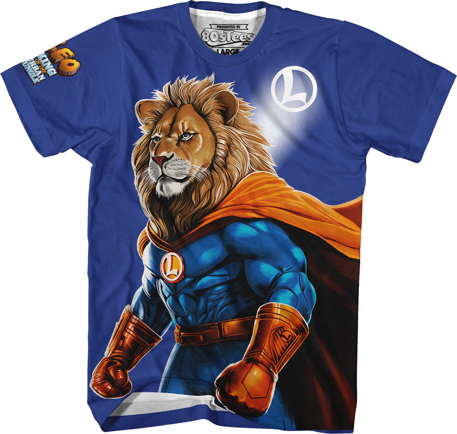 This 80sTees.com exclusive Lionel Trains t-shirt shows the Lionel Symbol shining in the sky and the Lionel mascot dressed as a superhero for the 2025 New York Comic-Con. The right sleeve reads "Leo King Of The Urban Jungle". The back of the shirt shows the year 2025, "Elevator at 11th Ave Subway", and the Lionel logo.