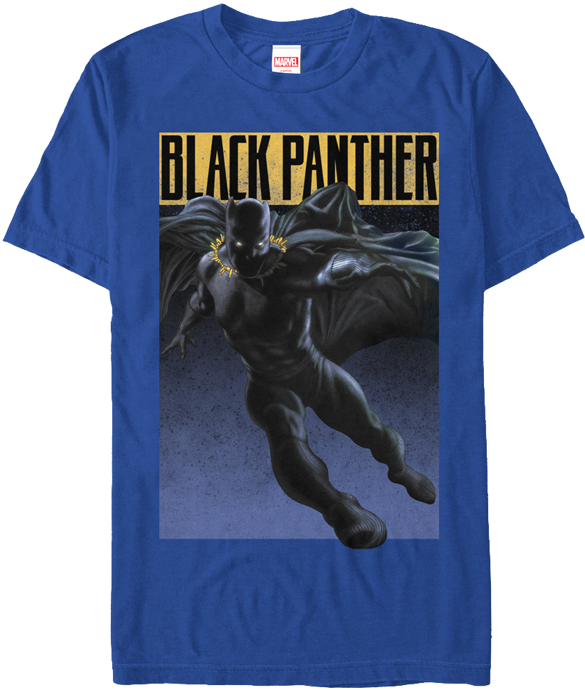This Black Panther t-shirt shows the great cat jumping into action, ready to protect his homeland Wakanda. Black Panther is seen wearing his trademark outfit, which includes a Vibranium suit, glare-cutting lenses, and a cloak. With exciting adventures in the pages of comics and on the screen in the Marvel Cinematic Universe, Black Panther is one of the most instantly recognizable characters in Marvel Comics. Let everyone know that you are a fan of the man without fear with this King of Wakanda Black Panther t-shirt.