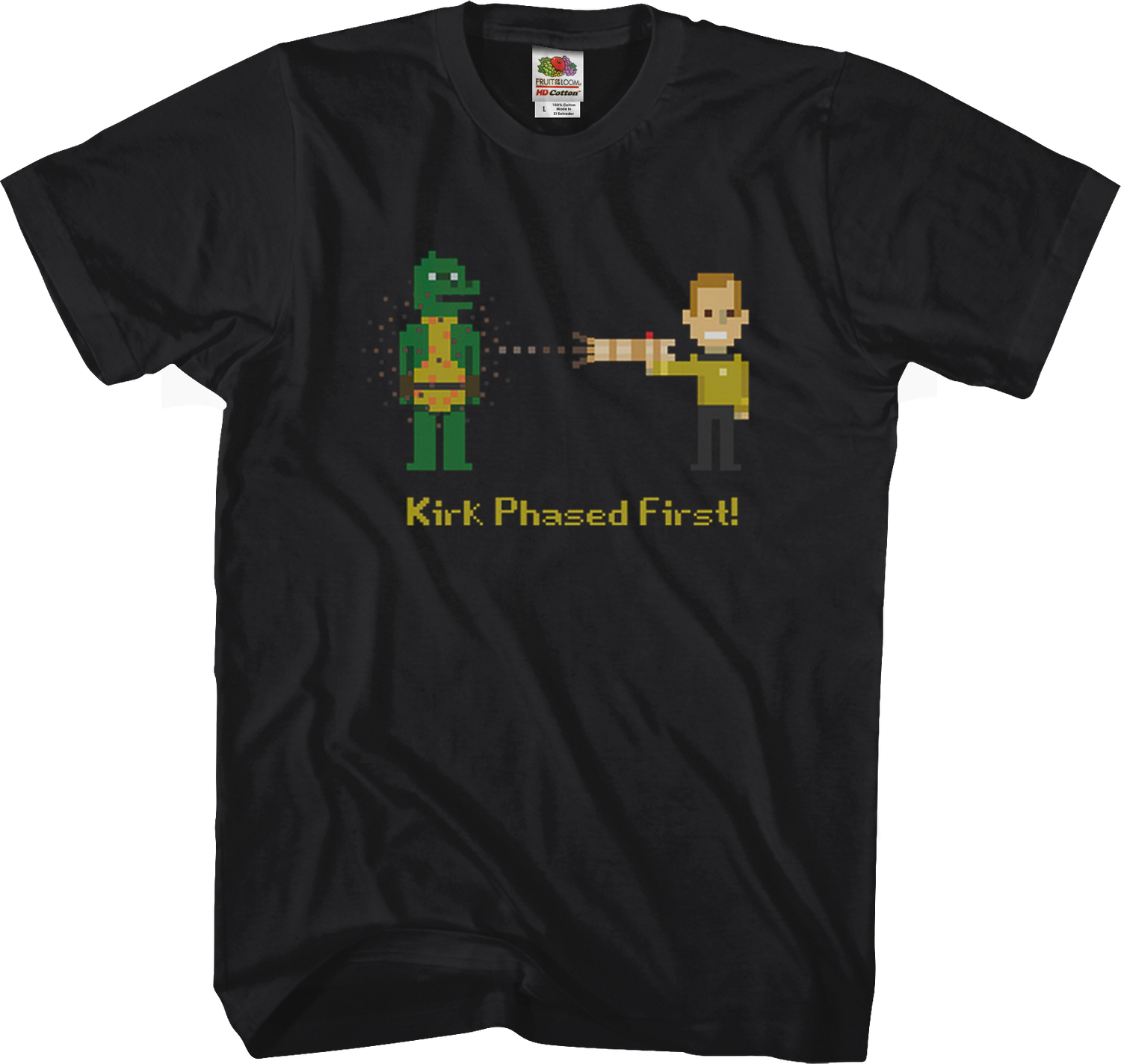 This Star Trek t-shirt features an 8-bit image of Captain Kirk firing a makeshift weapon at a Gorn. The shirt reads Kirk Phased First!