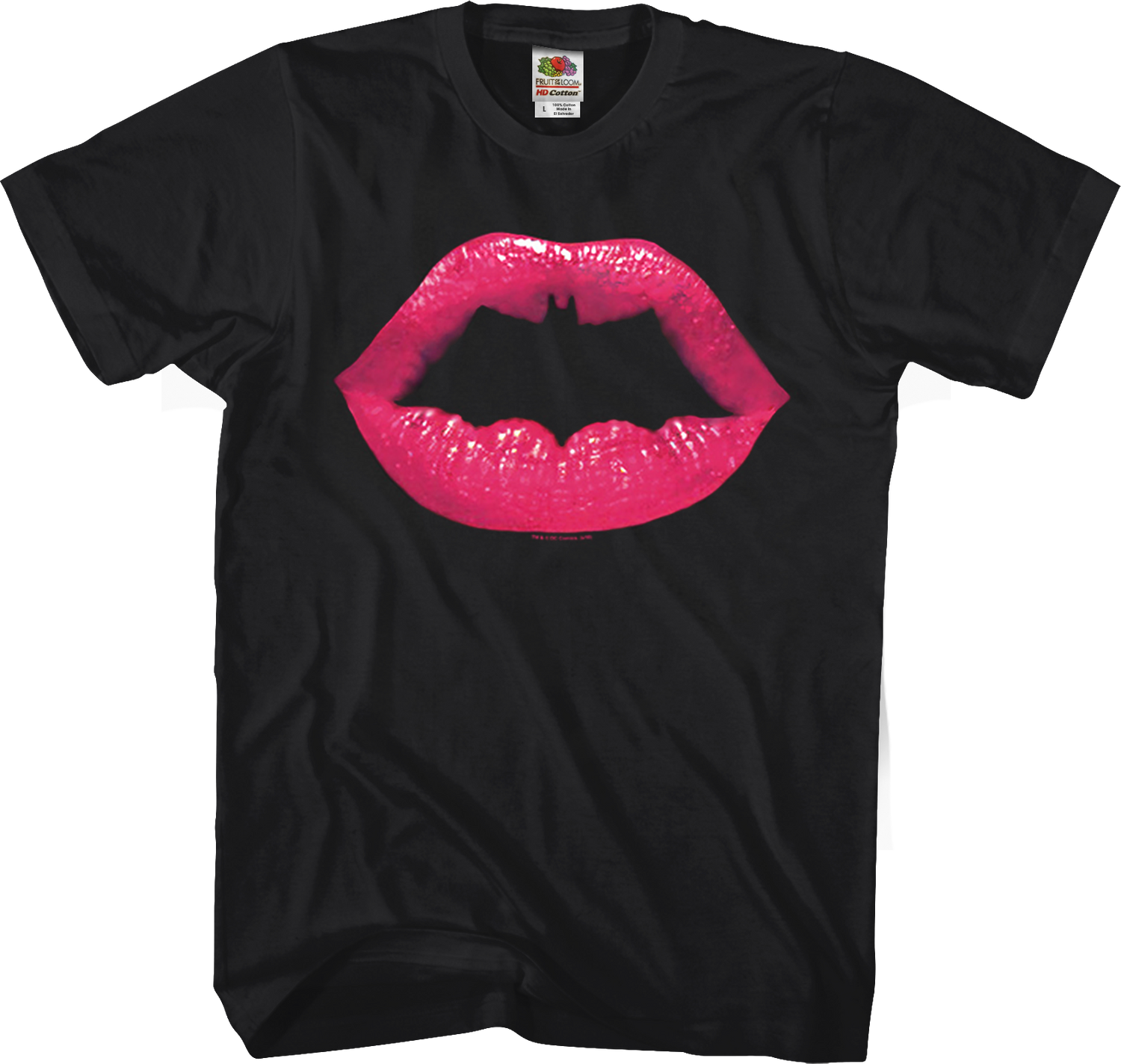 This Batman tee features a set of luscious lips, reminiscent of the Rocky Horror Picture Show, forming the iconic Batman logo.