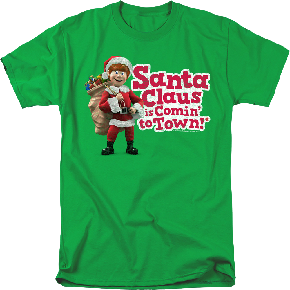 Santa Claus Is Comin' To Town is a 1970 stop motion animation movie has become a Christmas staple. Fred Astaire voiced the narrator, Special Delivery "S.D." Kluger, and Mickey Rooney was the voice of Kris Kringle in the movie that told the story of the origin of Santa. Let everyone know you are a fan of the holiday classic with this Kris Kringle Santa Claus Is Comin' To Town T-Shirt!