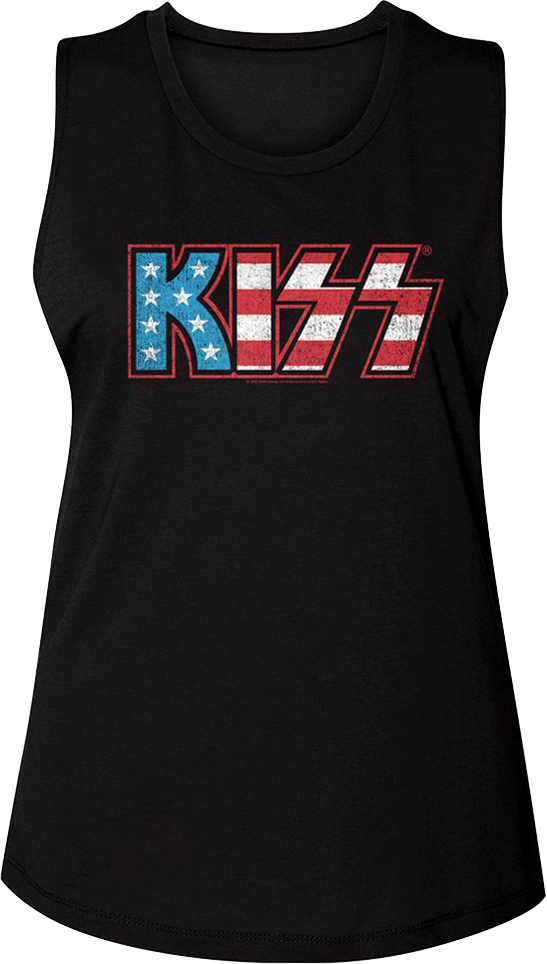 KISS is one of the most popular and influential rock bands ever. Let everyone know that you are a fan with this Ladies American Flag Logo KISS Muscle Tank Top!