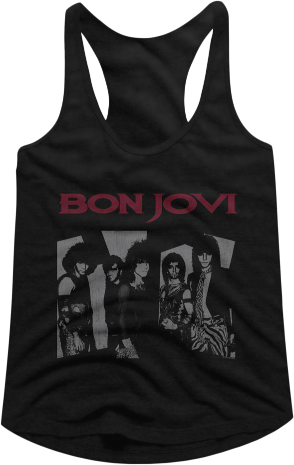 Let everyone know that you are a life-long fan of the iconic rock band with this Ladies Black and White Bon Jovi Racerback Tank Top!