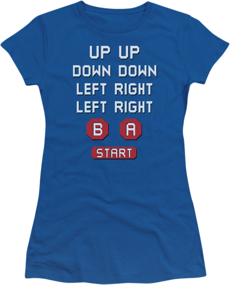 This Ladies Contra Cheat Code 30 Lives Shirt shows the cheat code that a player could enter to get extra lives in the classic video game. The cheat code, dubbed the "Contra Code" seen on this t-shirt is Up, Up, Down, Down, Left, Right, Left, Right, B, A, Start. When trying to defeat the evil Red Falcon Organization in the original Contra game, a player needed as many lives as they could get, which made the Contra Code a valuable cheat code to have.