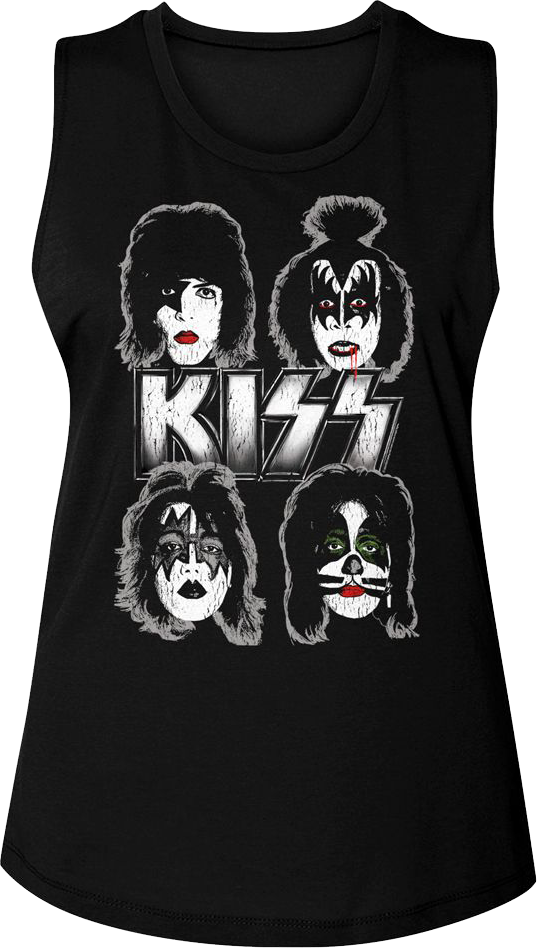 If you like to rock and roll all night and party every day, you are probably a member of the KISS Army. Now, you can show that you are a fan with this Ladies Face Paint KISS muscle tank top featuring "The Starchild" Paul Stanley, "The Demon" Gene Simmons, "The Spaceman" Ace Frehley, and "The Cat" Peter Criss. These creatures of the night are best known for putting on some of the most electrifying live performances of all time. Now, you can proudly show that you are a fan with this Ladies Face Paint KISS Muscle Tank Top!