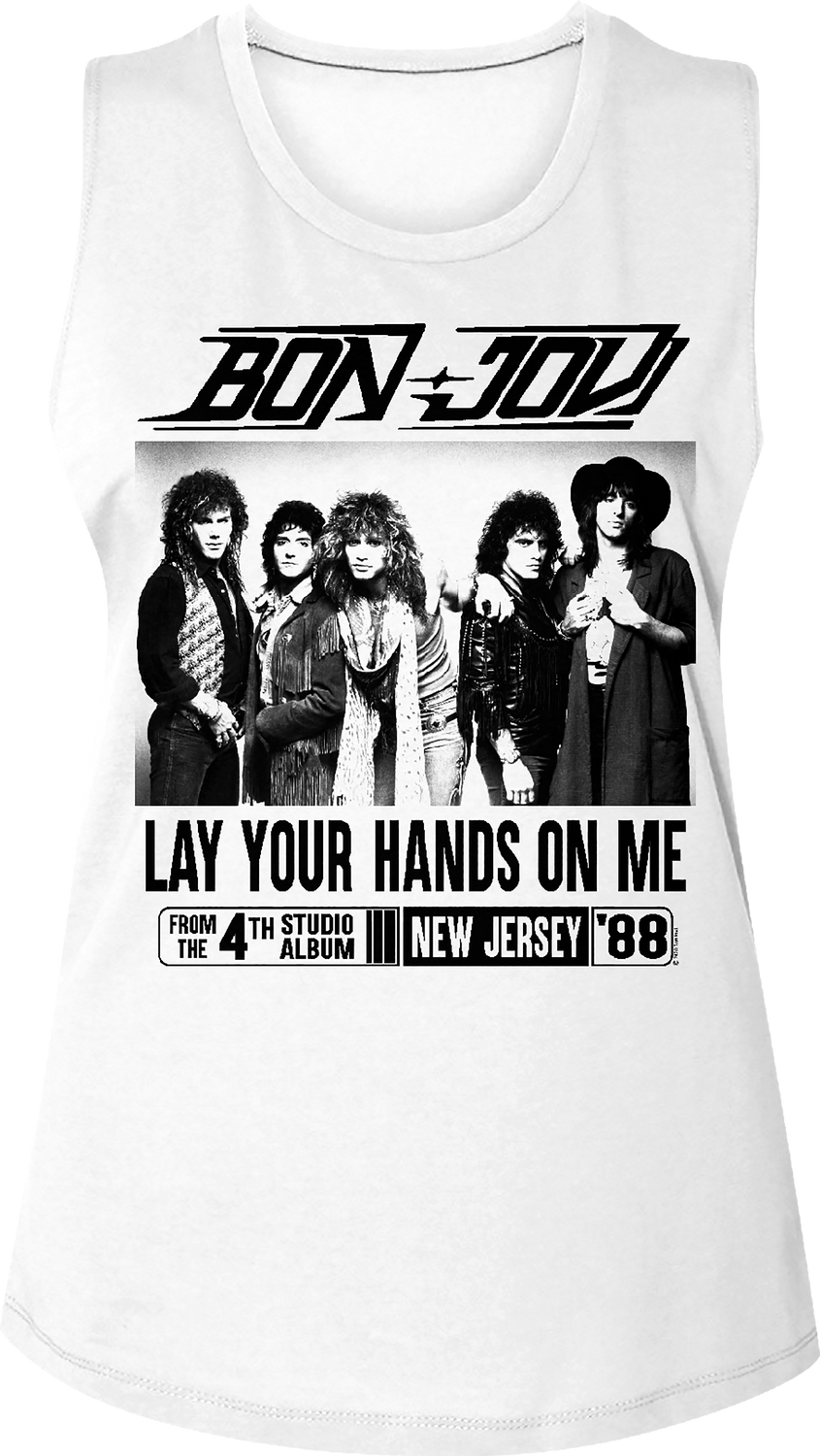 Fighters, poets, preachers and teachers will know you are a Bon Jovi fan when you wear this Ladies Lay Your Hands On Me Bon Jovi Muscle Tank Top!