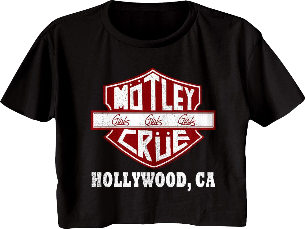 This ladies Motley Crue crop top shows the legendary metal band's name in the shape of the Harley-Davidson logo. The center of the logo includes the title of Motley Crue's hit song "Girls, Girls, Girls".