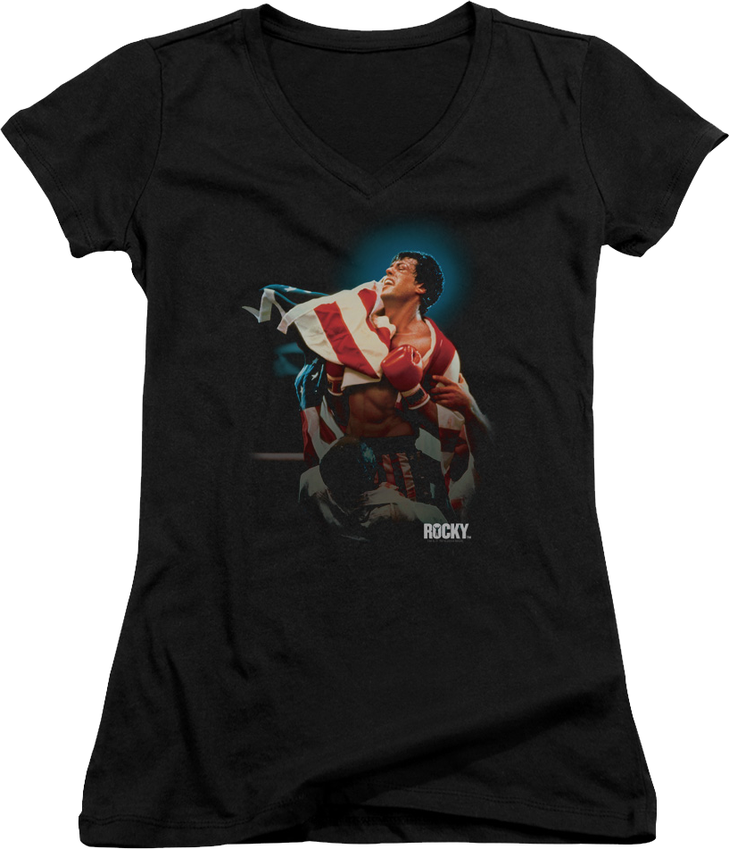 For any fan of the Italian Stallion, this Ladies Movie Poster Rocky IV V-Neck Shirt is a must have!