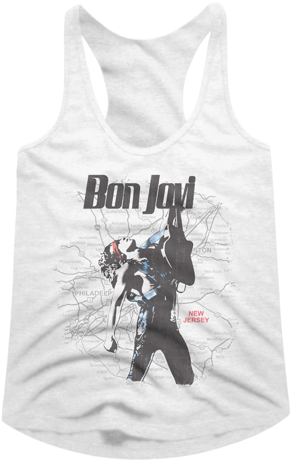Everyone will immediately know that you are a fan of Bon Jovi when you wear this Ladies New Jersey Map Bon Jovi Racerback Tank Top!
