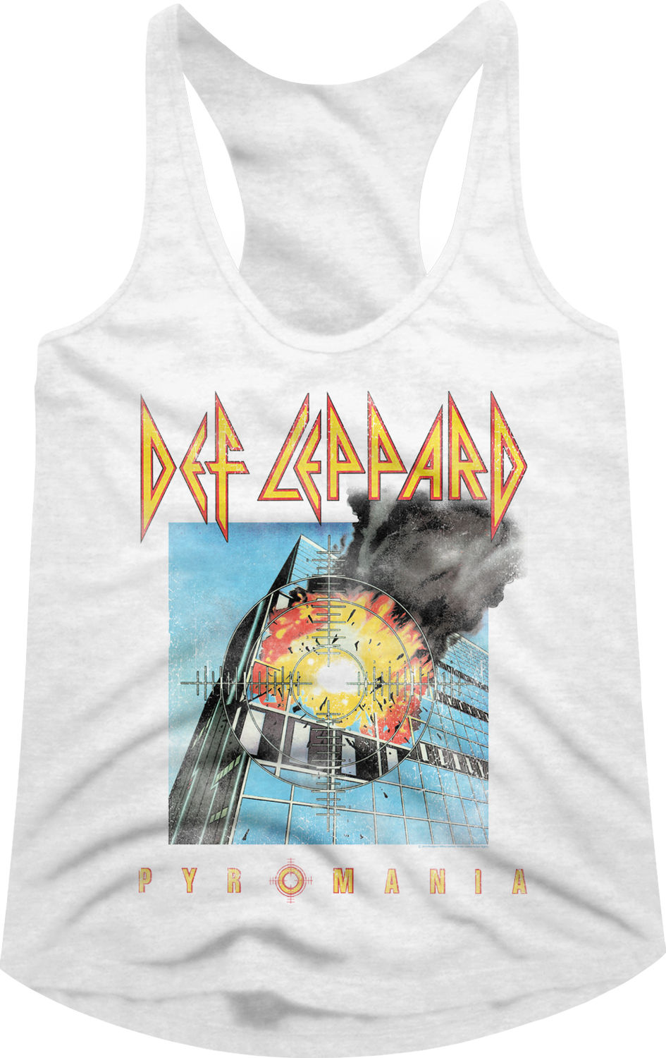 This ladies Def Leppard racerback tank top features the cover artwork for the legendary rock band's third studio album, Pyromania.