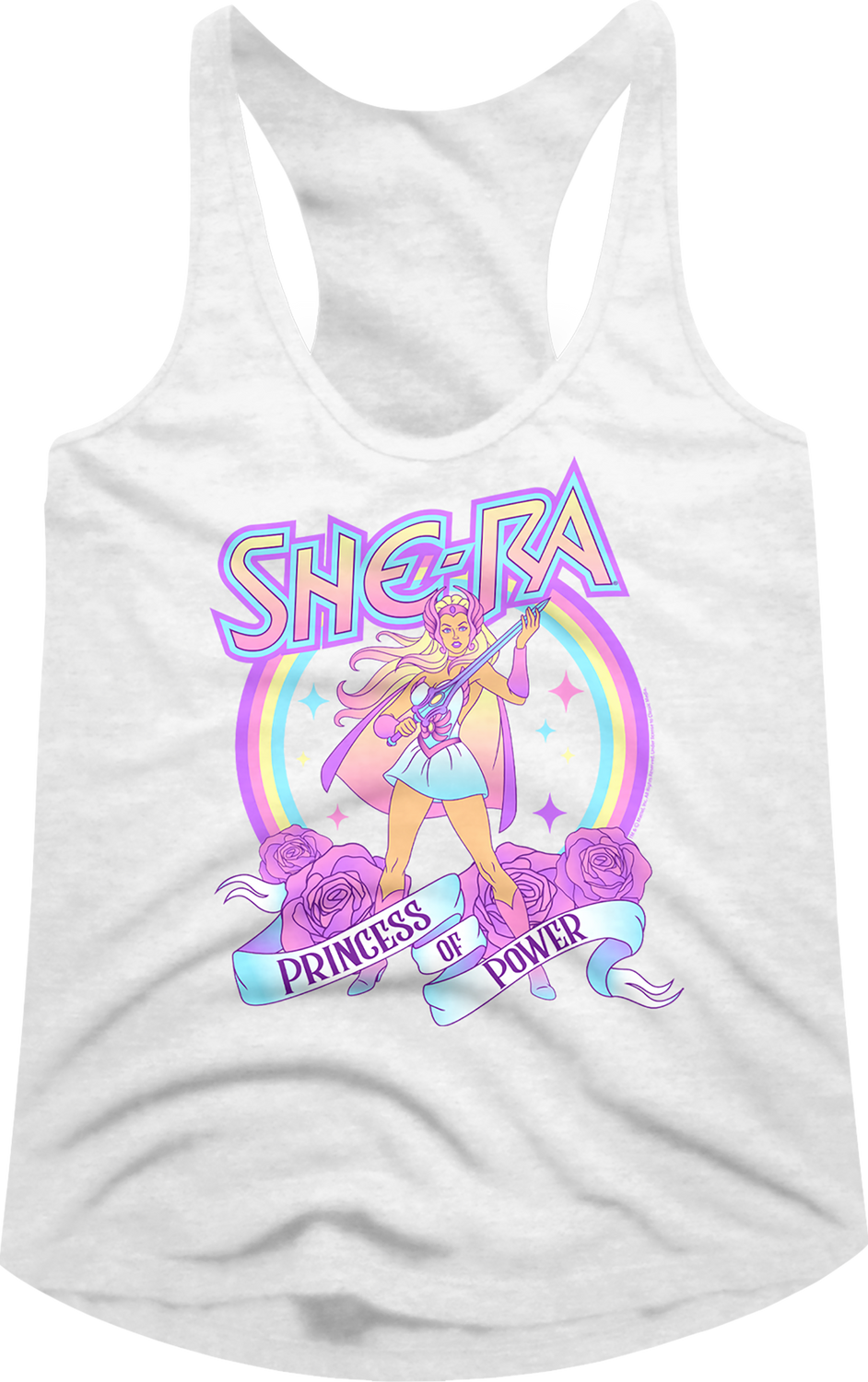 This ladies She-Ra racerback tank top shows She-Ra ready to defend Crystal Castle with her Sword of Protection. She-Ra is seen posing in front of stars and a rainbow. The tank top includes flowers and a banner that reads Princess of Power.