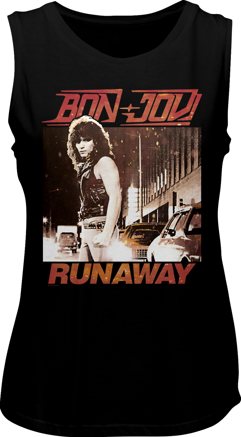This ladies Bon Jovi muscle tank top features the cover artwork for the band's self-titled debut album. The shirt includes the title of the hit single from the album, "Runaway".