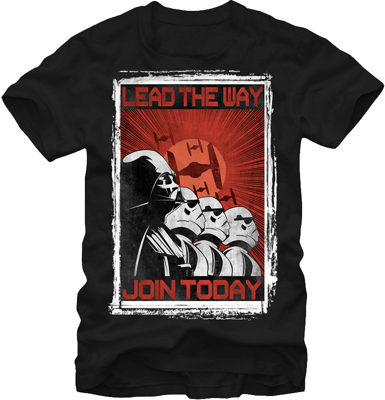 This Star Wars shirt shows a propaganda-style picture with Darth Vader, Stormtroopers and TIE fighters, and the shirt reads Lead The Way, Join Today. To know the ways of the Dark Side is to know great power. All you have to do is submit to anger, rage, hatred, fear and aggression. Everyone who loves Star Wars will love seeing you in this shirt. Give yourself to the Dark Side with this Lead The Way shirt. Others may follow, and before you know it you'll have a Galactic Empire.