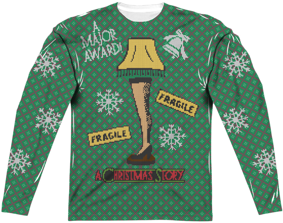 This Christmas Story long sleeve shirt is printed with an all over sublimation technique to look like a knitted sweater. The pictures show the famous Leg Lamp and the words Fragile and A Major Award in addition to the movie logo all on top of a snowflake pattern.