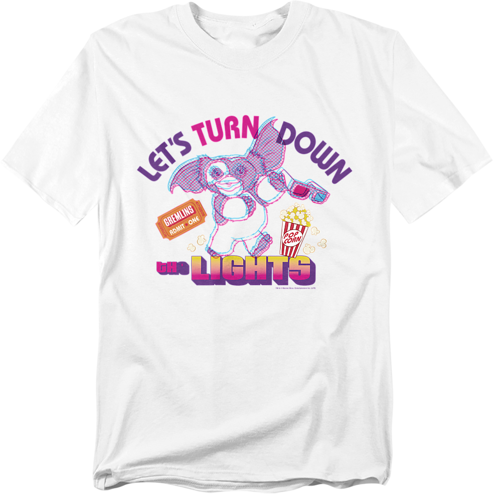 This Gremlins t-shirt features a 3-D image of Gizmo with 3-D glasses, a Gremlins movie ticket, and a bucket of popcorn. The shirt reads "Let's Turn Down the Lights."