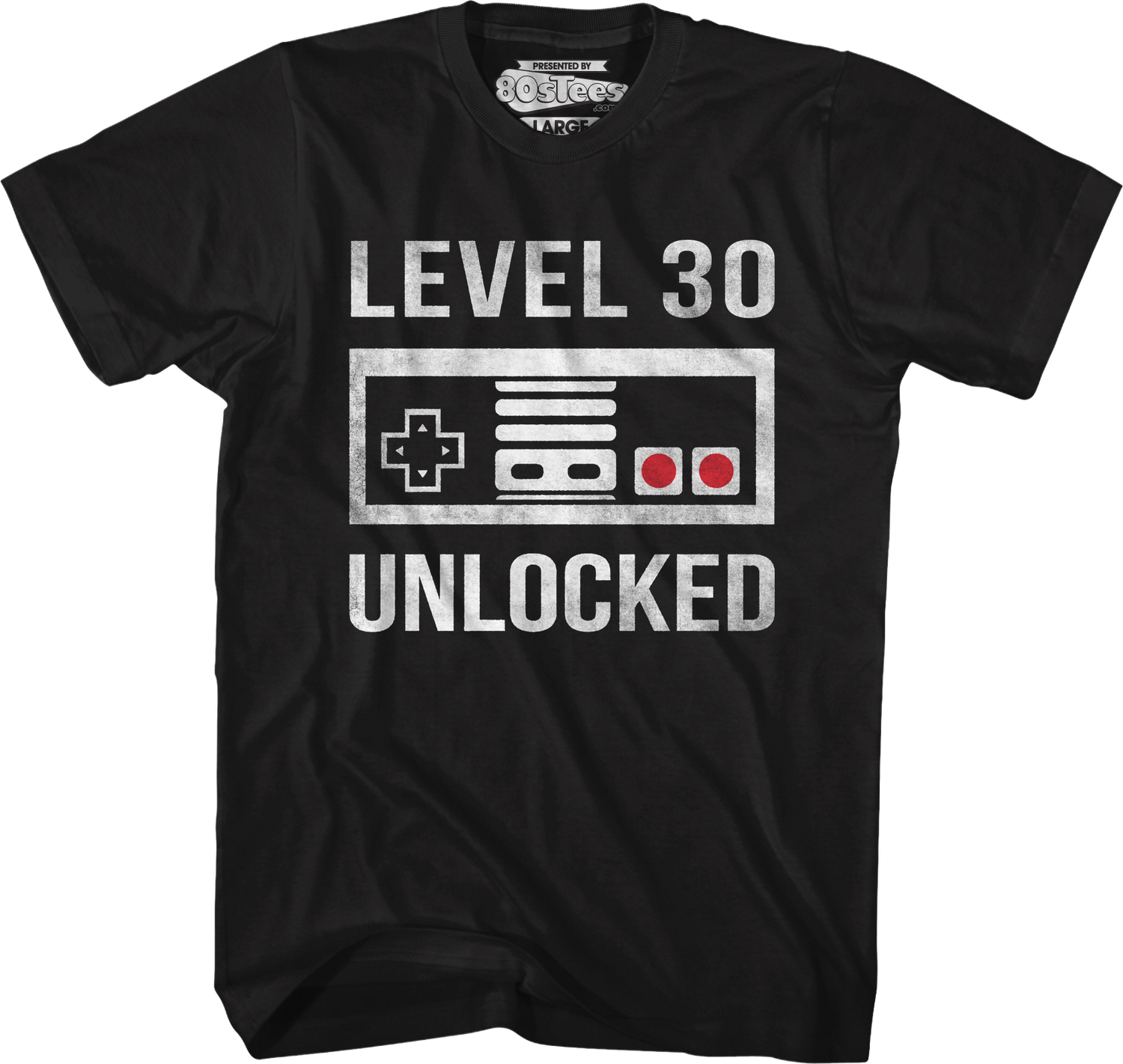 This 80sTees.com exclusive t-shirt features a controller for the Nintendo Entertainment System.  The shirt reads Level 30 Unlocked.