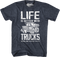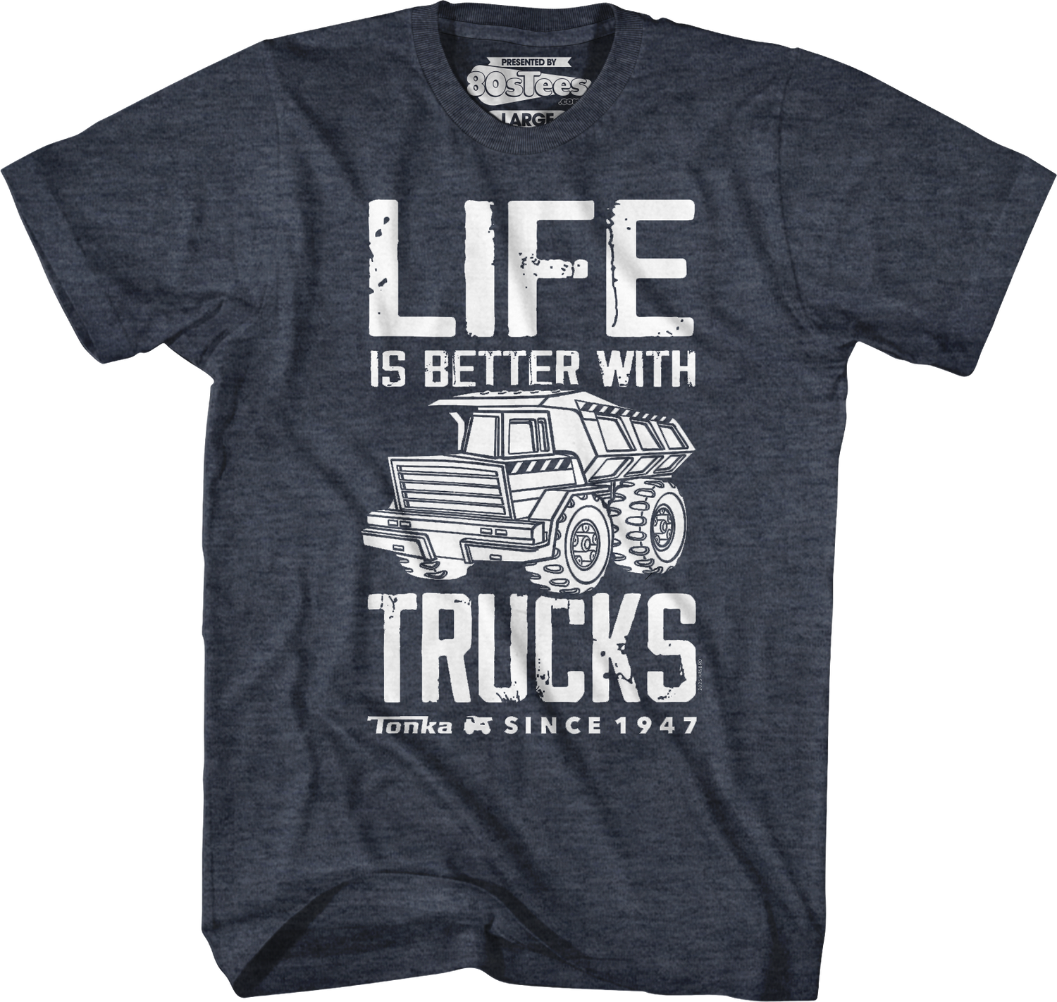 This 80sTees.com exclusive Tonka t-shirt features a dump truck that is built Tonka tough. The shirt reads Life Is Better With Trucks.