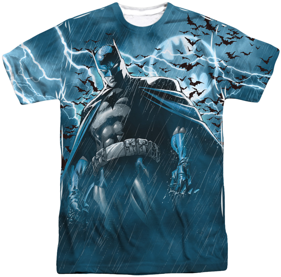Someone once told Bruce Wayne that a storm was coming. Well, here it is. This Batman shirt shows the Caped Crusader surrounded by lightning. With a unique sublimation print, Batman has never looked so life-like on a shirt before. It doesn't take a brilliant detective to realize that this is a great Batman shirt, with the Dark Knight's faithful bats on the front and back. Batman fans will certainly enjoy this shirt, featuring the one hero that Gotham City deserves. With the instantly recognizable Batman on your shirt, you'll have people sounding like Jack Napier saying, "Nice outfit".
