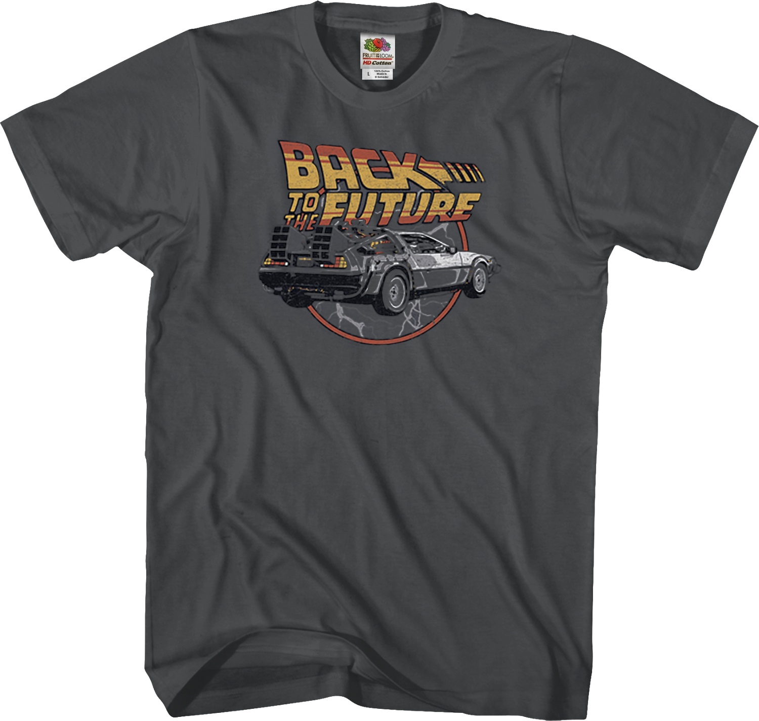 This Lightning Bolts Back To The Future T-Shirt shows the back of Doc Brown's DeLorean, complete with the OUTATIME license plate. Doc's time machine is surrounded by lightning bolts.