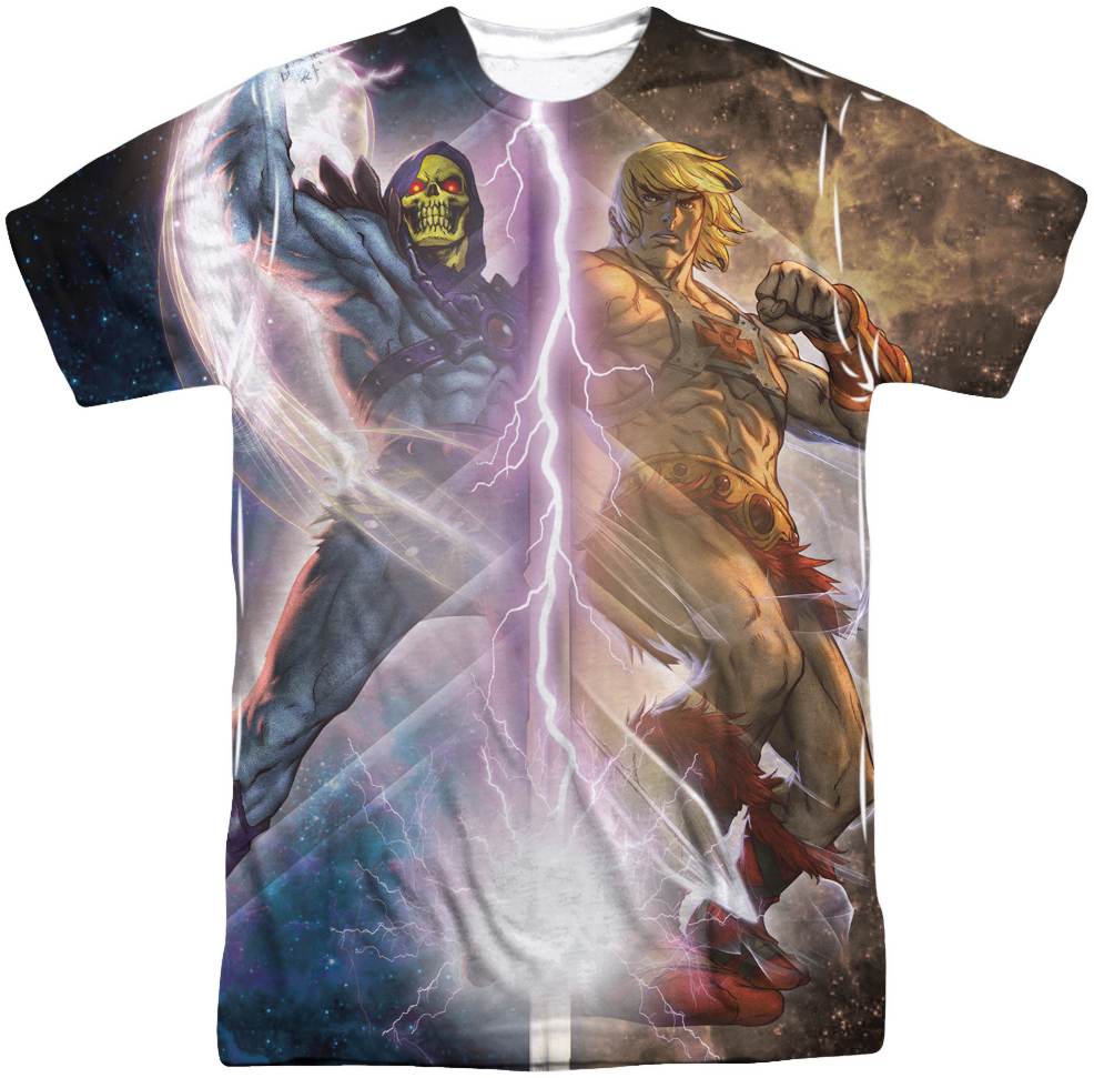 This Masters of the Universe shirt shows a lightning bolt separating Skeletor and He-Man. The back of the shirt shows He-Man's Power Sword crossed with Skeletor's Havoc Staff. The Overlord of Evil and the most powerful man in the universe have had many battles for control of Eternia and Castle Grayskull. This shirt depicts the electrically charged struggle that exists between Skeletor and He-Man. For any fan of Masters of the Universe, this Lightning shirt is a must have.