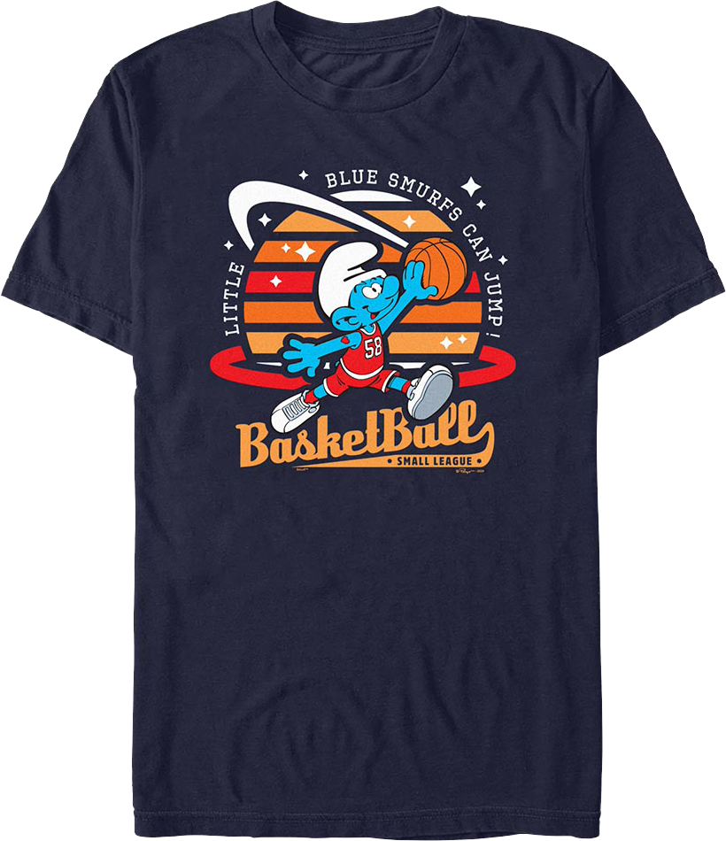 This Smurfs t-shirt shows a Smurf jumping with a basketball. The shirt reads Little Blue Smurfs Can Jump!