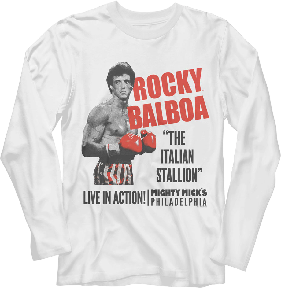 This Rocky long sleeve shirt features an image promoting a live appearance by Rocky Balboa at Mighty Mick's gym in Philadelphia.
