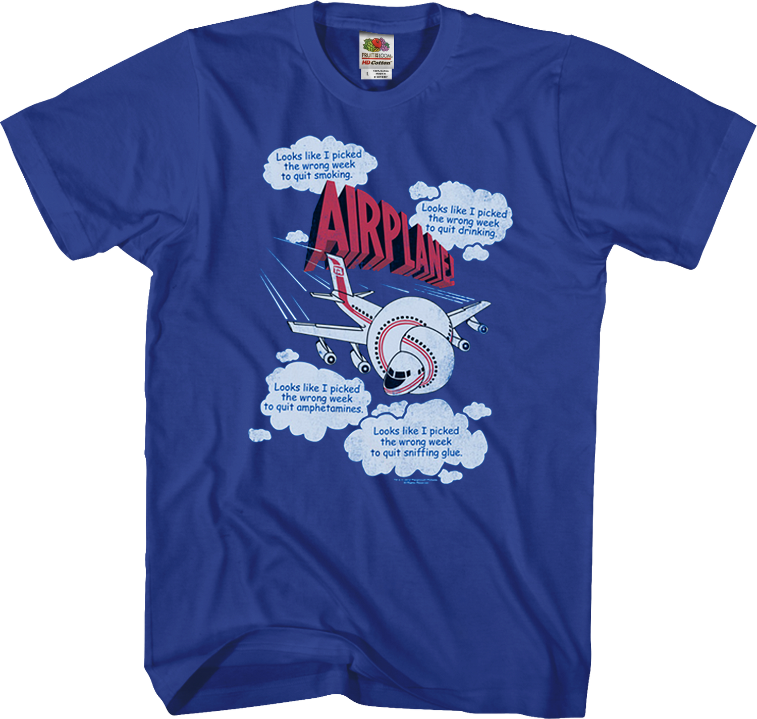 The movie Airplane has flown to the top of countless lists of the top comedies of all time. Now, you can show your love for the craziest flight ever taken with this Looks Like I Picked The Wrong Week Airplane T-Shirt. This shirt features the poster artwork for Airplane, a plane twisted in a knot. Also featured are the quotes by Steven McCroskey, played by Lloyd Bridges, where he regrets his decision to quit his many vices this week.