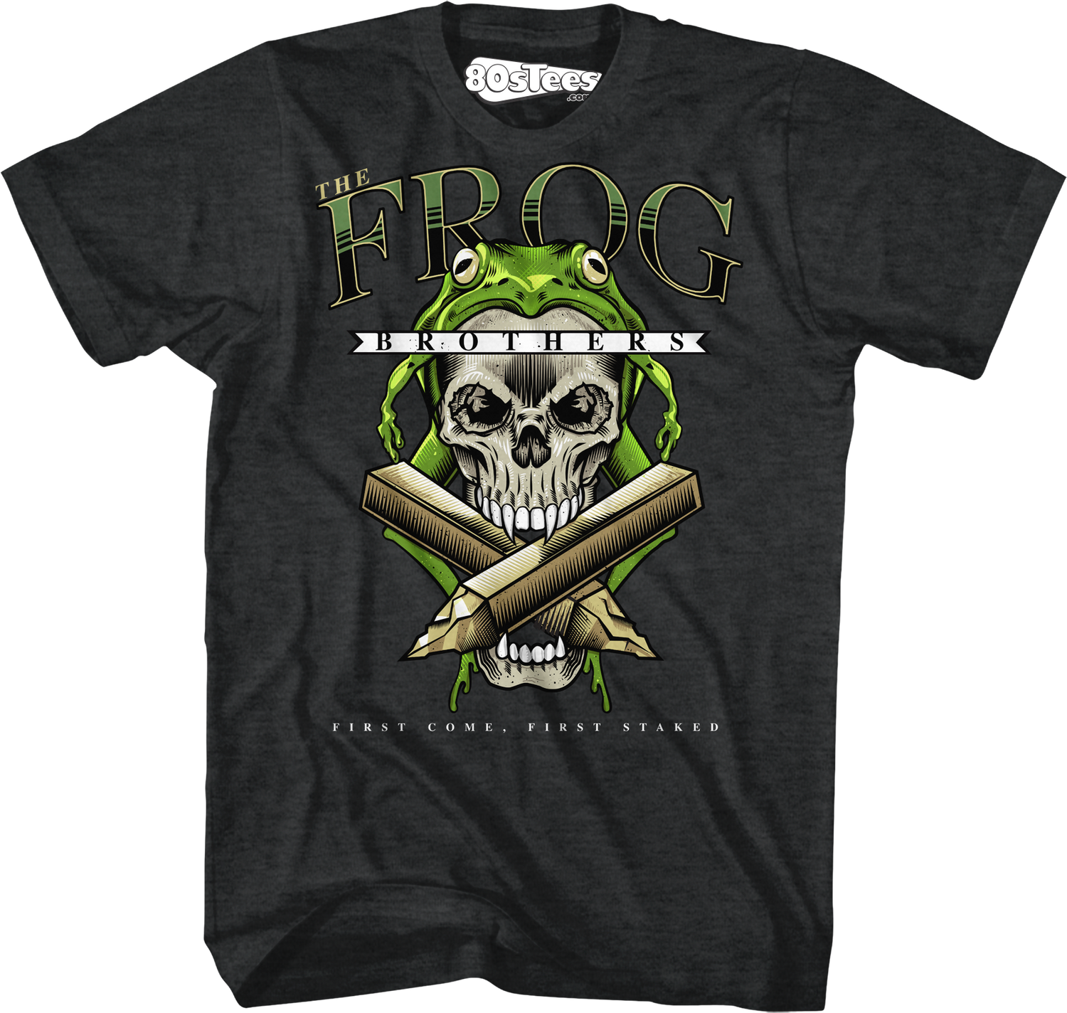 This 80sTees.com exclusive Lost Boys t-shirt features a logo for Edgar and Alan, the Frog brothers. The logo shows a frog on top of a vampire's skull that is holding crossed stakes in its sharp teeth. The shirt includes a little vampire humor that reads First Come, First Staked.