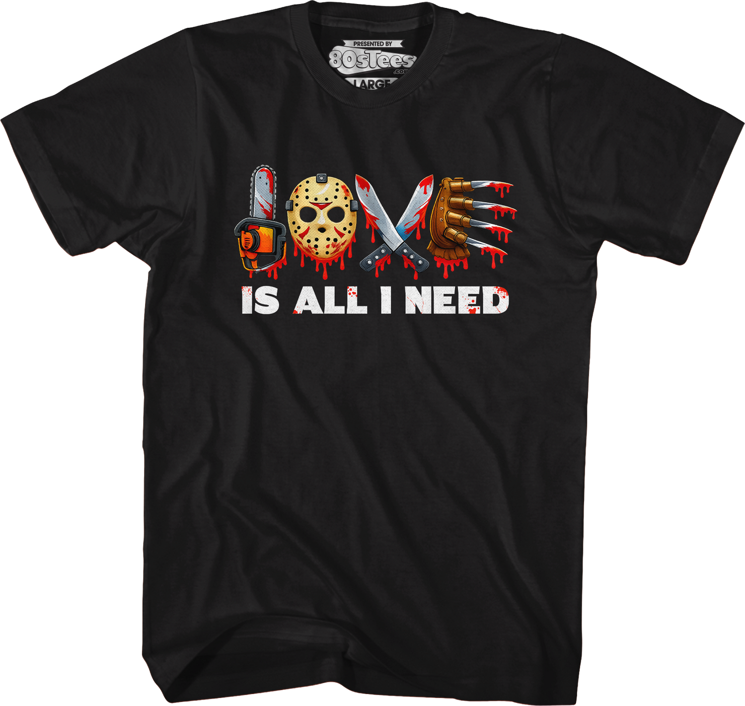 Horror movies always show a monster or killer chasing after the girl of their demented dreams. These movies are the perfect entertainment for Valentine's Day. Let everyone know you are a true horror fanatic with this 80sTees.com exclusive Love Is All I Need T-Shirt!
