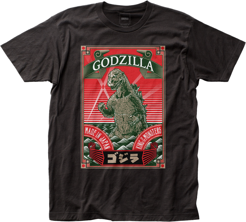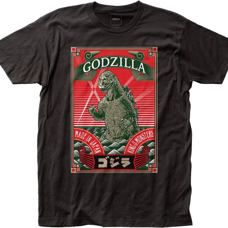 This Godzilla t-shirt features a colorful poster of the King of the Monsters. The shirt reads Made In Japan, and includes Godzilla's name in Japanese text.