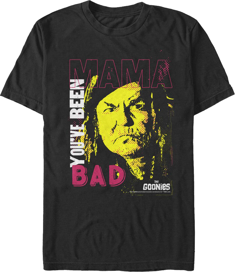 This Goonies t-shirt features an image of Mama Fratelli. The shirt includes her son Sloth's quote, "You've been bad".
