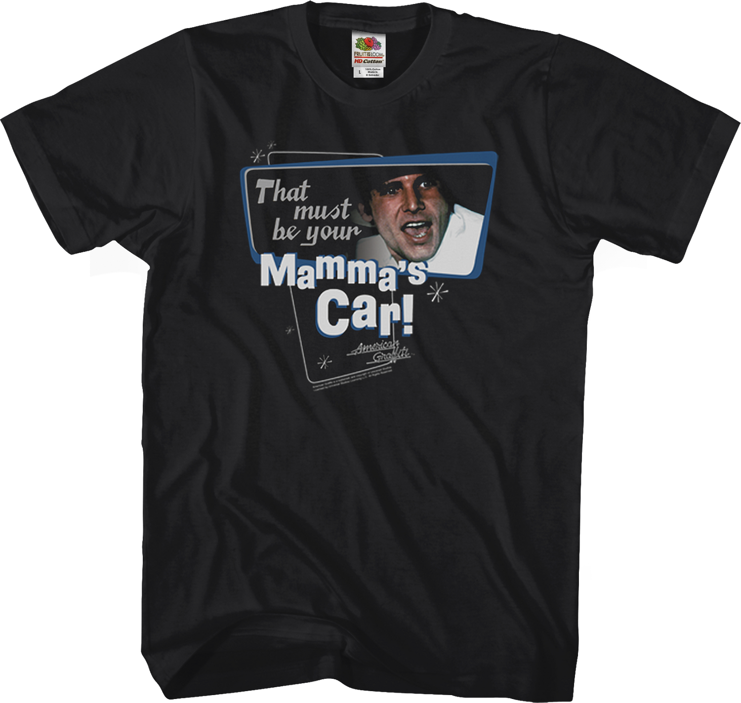 This Mama's Car American Graffiti T-Shirt shows Harrison Ford as Bob Falfa yelling out of his car window goading John into a street race. His quote reads, "That must me your mamma's Car!" In the 1973 movie, Ron Howard and Richard Dreyfuss spend the last night of summer cruising around in hot rods, searching for a beauty in a Thunderbird, and listening to the voice of Wolfman Jack.