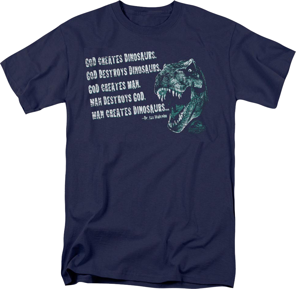 This Jurassic Park t-shirt shows a Tyrannosaurus rex and includes Ian Malcolm's quote, "God creates dinosaurs. God destroys dinosaurs. God creates man. Man destroys God. Man creates dinosaurs..."