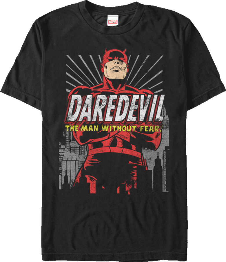 Blinded by a radioactive isotope, Matthew Murdock realized that he had developed a superhuman sensory system more powerful than Spidey-Sense. From that moment on, Murdock would become the morally righteous crime fighter known as Daredevil. This t-shirt features an image of Daredevil in a heroic pose with a city background and reads, "Daredevil The Man Without Fear."