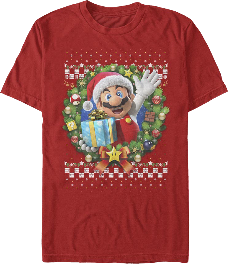 Mario has also been called the "most recognizable" figure in the gaming industry. Everyone will know you are a fan this holiday season when you wear this Mario Christmas Wreath Nintendo T-Shirt!