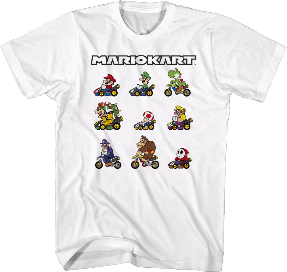 This Mario Kart t-shirt shows the characters Mario, Luigi, Yoshi, Bowser, Toad, Wario, Waluigi, Donkey Kong, and Shy Guy ready to race.