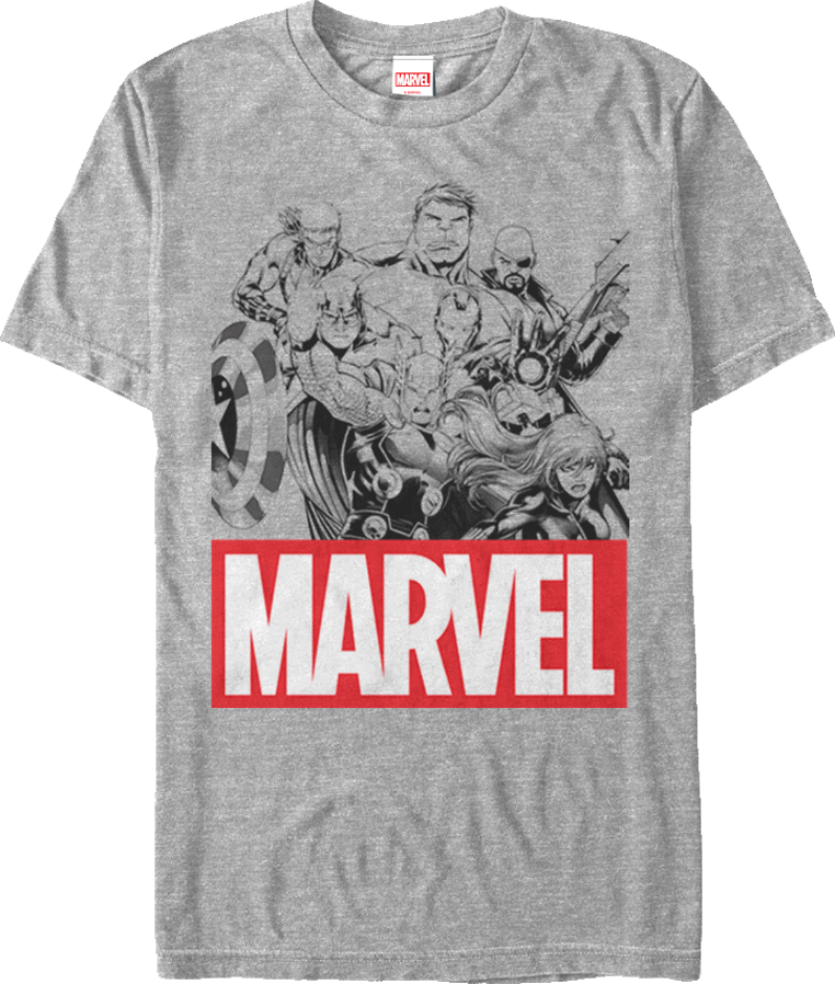 This Marvel Avengers Group Sketch T-Shirt shows the superheroes assembling together to battle the many faces of evil. The Avengers that appear on this shirt are Thor, The Incredible Hulk, Black Widow, Iron Man, Hawkeye, Nick Fury and Captain America in pencil sketch style. The Marvel logo appears on the bottom of the group. With an Asgardian god, an enormous green rage monster, a beautiful assassin, and a patriotic warrior, a lethal sniper, and an all-knowing leader, it's difficult not to love the team that makes up "Earth's Mightiest Heroes." Show everyone that you are a fan of classic team with this Marvel Avengers Group Sketch T-Shirt.