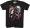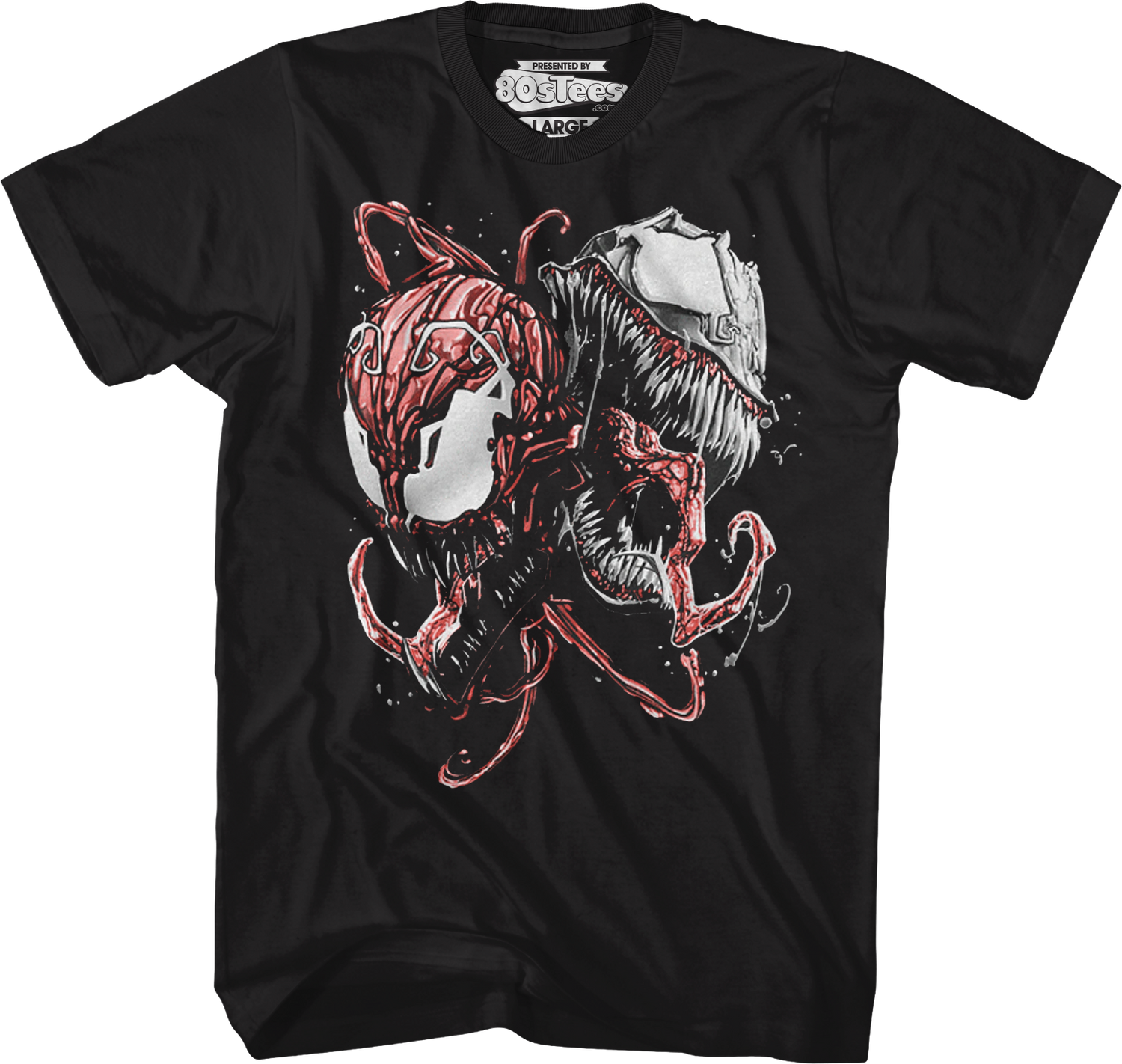 This Marvel Carnage and Venom T-Shirt shows the faces of the alien symbiote, Venom, and his offspring, Carnage. While Eddie Brock was in prison, the symbiote entered the bloodstream of Cletus Kasady, the serial killer and another Marvel Comics villain was born.
