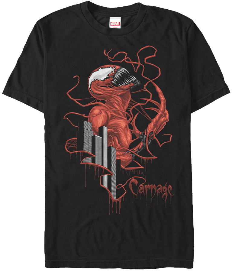 Carnage is what you get when you mix an alien symbiote offspring with serial killer Cletus Kasady. This shirt shows the Venom-like Carnage in all its psychotic glory. Because a symbiote adapts to a host's personality, Carnage takes on Kasady's destructive and violent nature. The picture on this shirt shows the villain rising up over the city.