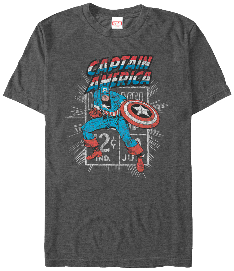 Show that you're a fan of the Avenger who's been entertaining audiences since 1941 with this Marvel Stamp Captain America T-Shirt. Fun Fact: in 2007, the Postal Service issued the 41-cent Marvel Super Heroes commemorative stamps in twenty designs.