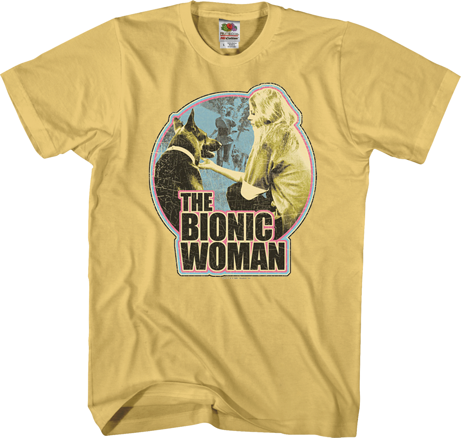 This Bionic Woman t-shirt features an image of the first female cyborg Jaime Sommers and her bionic German Shepherd, Max.