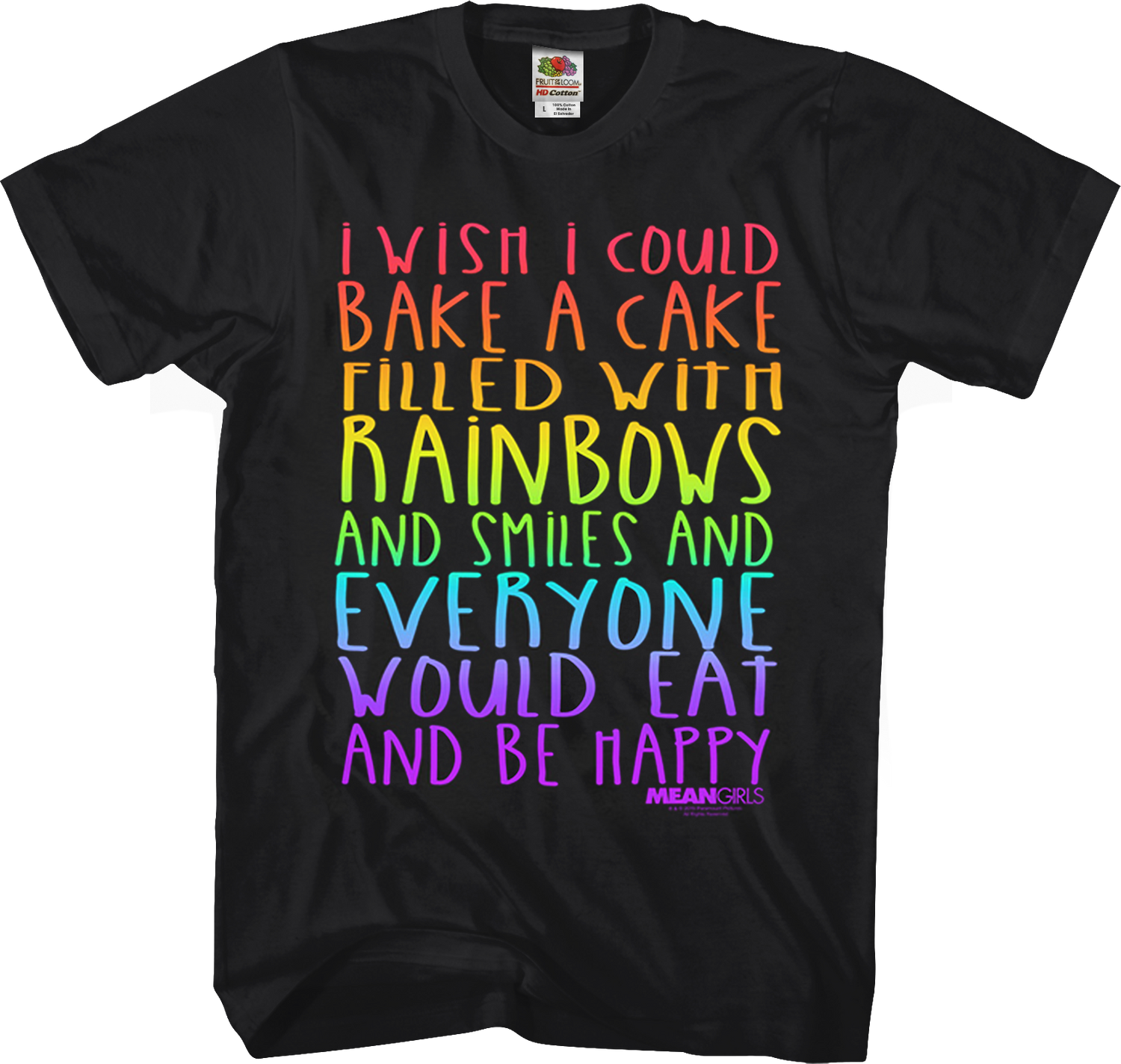 This Mean Girls shirt features one of the most memorable quotes from the 2004 movie, "I wish that I could bake a cake made out of rainbows and smiles and everyone would eat and be happy". The quote is taken from a scene where a crying girl was giving a speech about how she would like to get along with everyone "like we used to in middle school." The girl was then interrupted by Damian Leigh, who proclaimed "She doesn't even go here!"