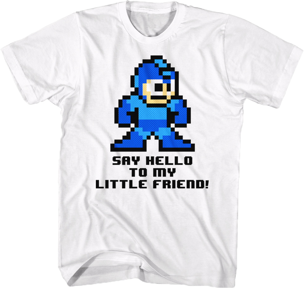 This Mega Man t-shirt features an image of the video game icon, and the shirt reads Say Hello To My Little Friend! Mega Man's little friend is his devastating Cannon Arm that he has used to become one of the most popular video game characters of all time. Now, you can show that you are a fan of Mega Man with this Little Friend t-shirt!