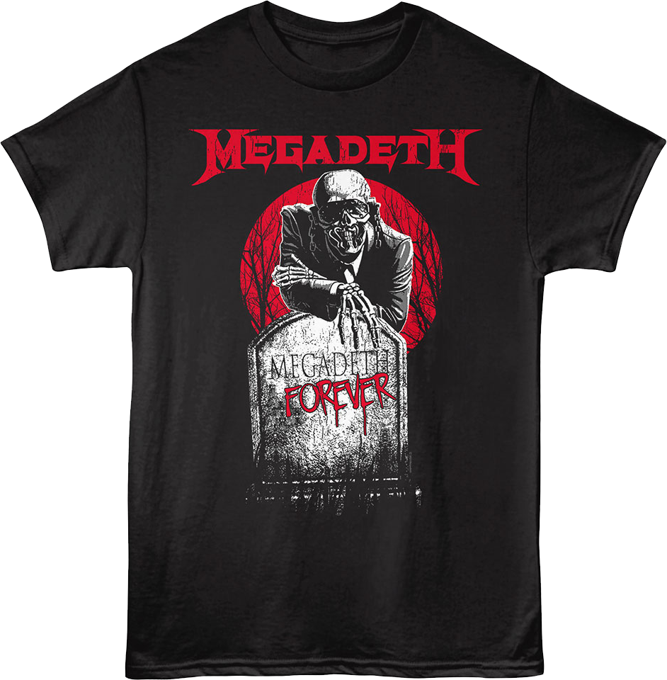 This Megadeth t-shirt shows the band's mascot, Vic Rattlehead leaning on a tombstone that reads "Megadeth Forever".