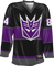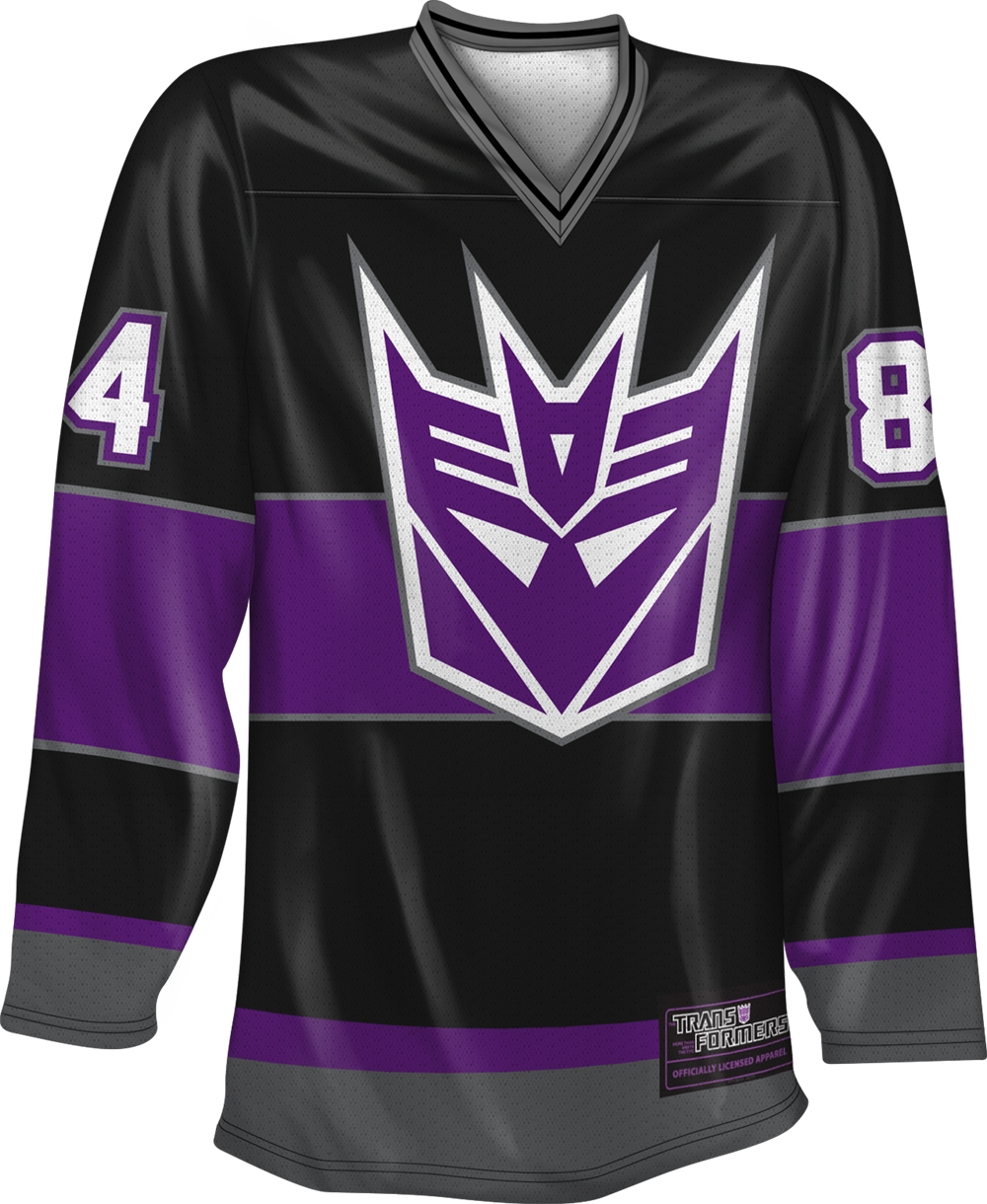 This hockey jersey is designed to look and feel just like an authentic team jersey. The jersey includes purple, black and gray colors to match Megatron. The jersey shows the Decepticons logo on the front and the name Megatron on the back. The jersey is given the number 84 because 1984 is the year that Megatron first declared war against the Autobots on the Transformers animated series.