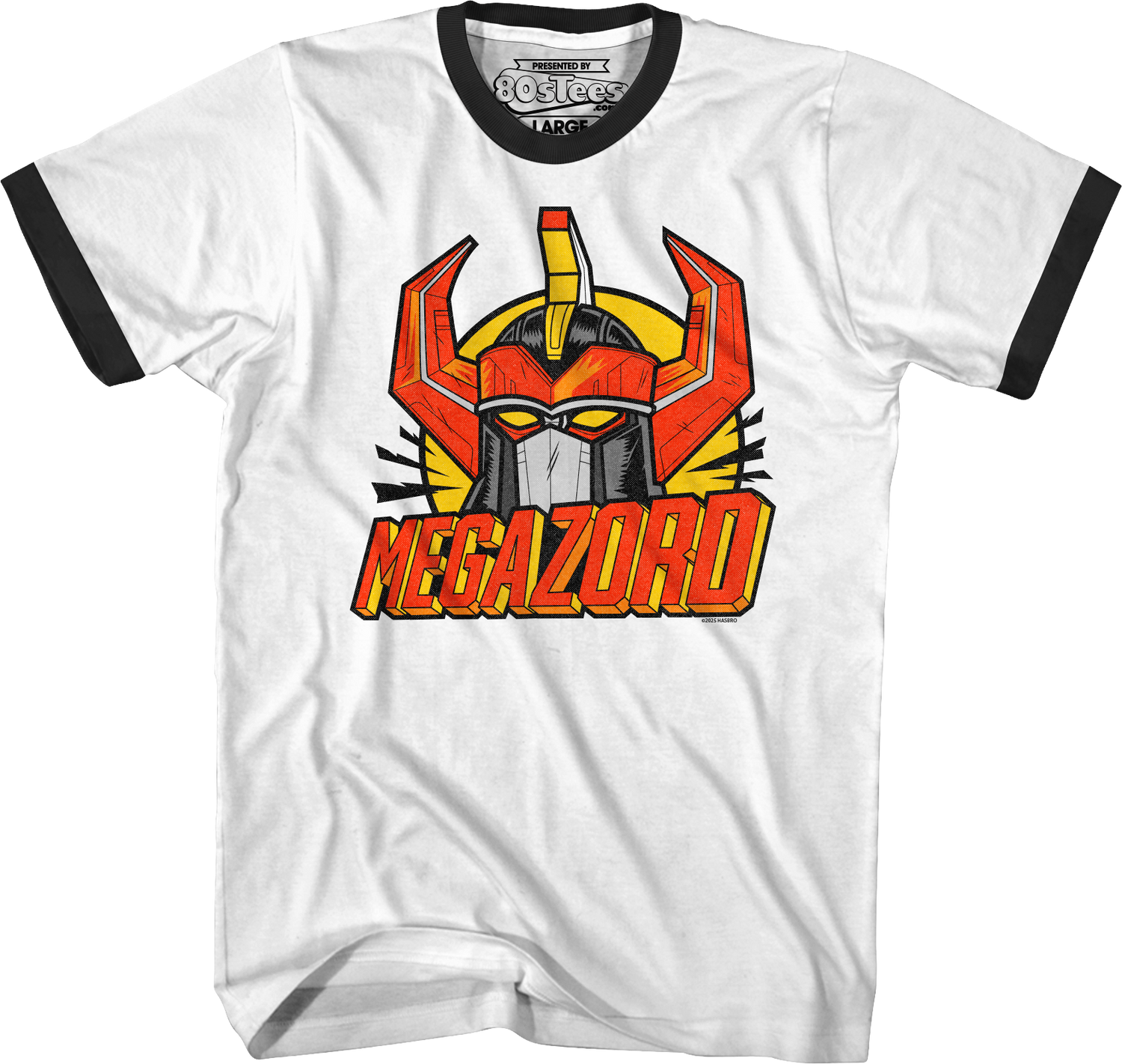 This 80sTees.com exclusive Mighty Morphin Power Rangers ringer shirt features the head of the Megazord, the ultimate symbol of the Power Rangers' teamwork.