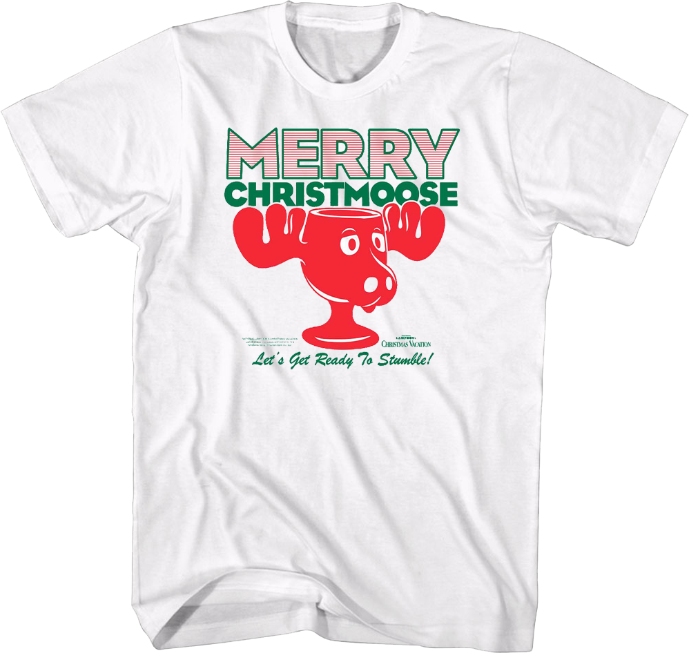 This Christmas Vacation t-shirt shows one of Clark Griswold's moose mugs. Above the mug, the shirt reads Merry Christmoose. Below the mug, the shirt reads Let's Get Ready To Stumble!